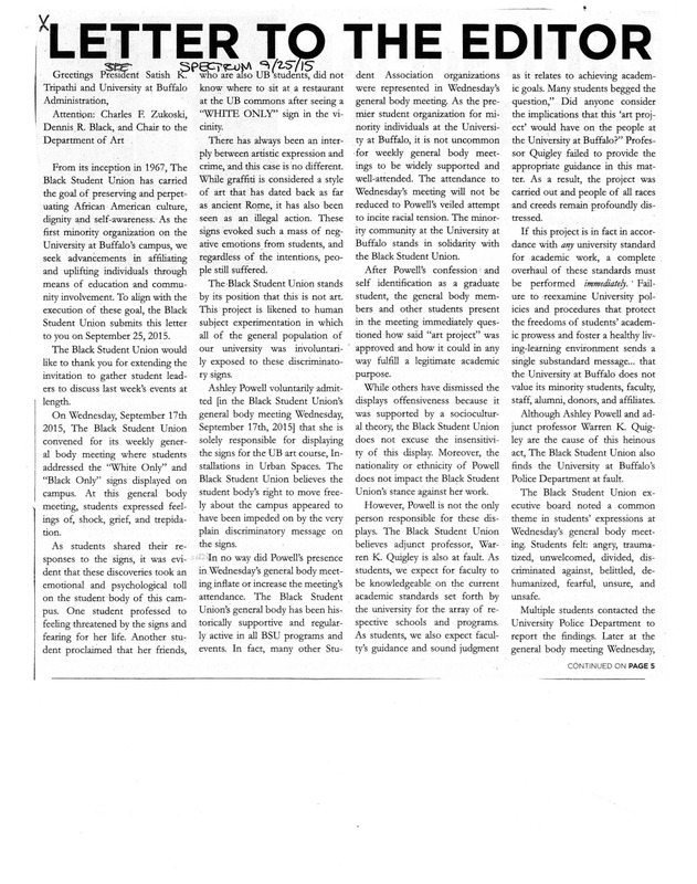- Photocopied pages of The Spectrum article "LETTER TO THE EDITOR," September 25, 2015.