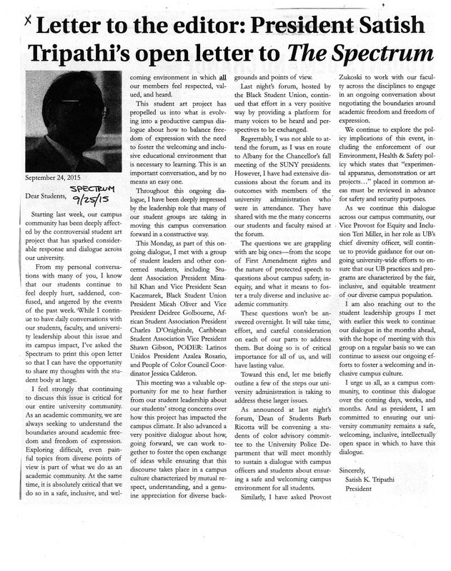- Letter to the editor: President Satish Tripathi's open letter to The Spectrum, September 25, 2015