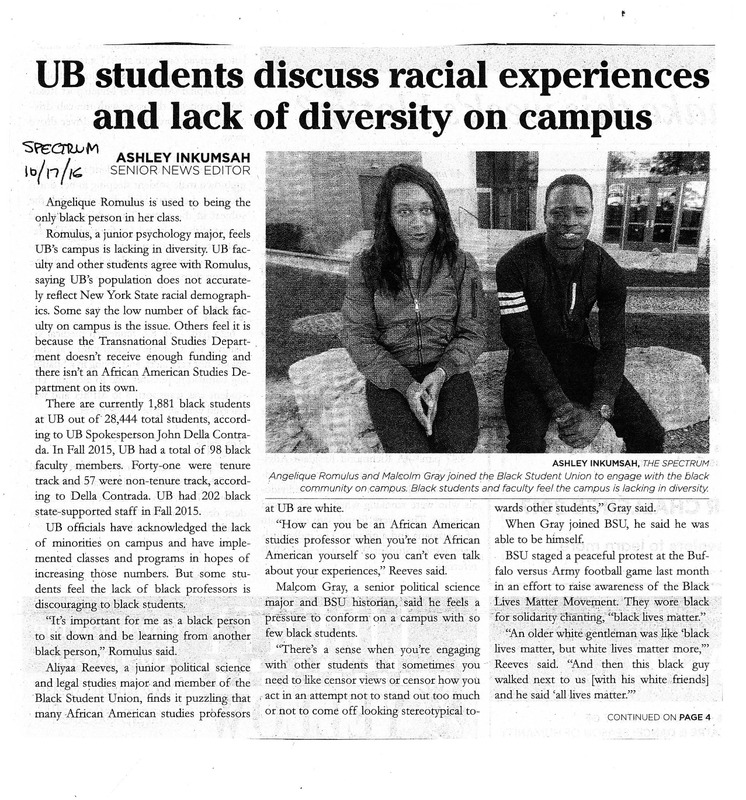 - Photocopied newspaper pages of The Spectrum article "UB students discuss racial experiences and lack of diversity on campus" by Ashley Inkumsah, October 17, 2016.