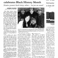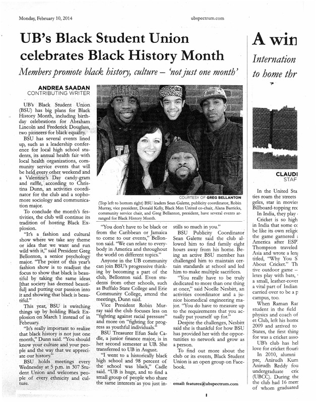 - Photocopied newspaper page of The Spectrum article "UB's Black Student Union celebrates Black History Month" by Andrea Saadan, February 10, 2014.