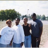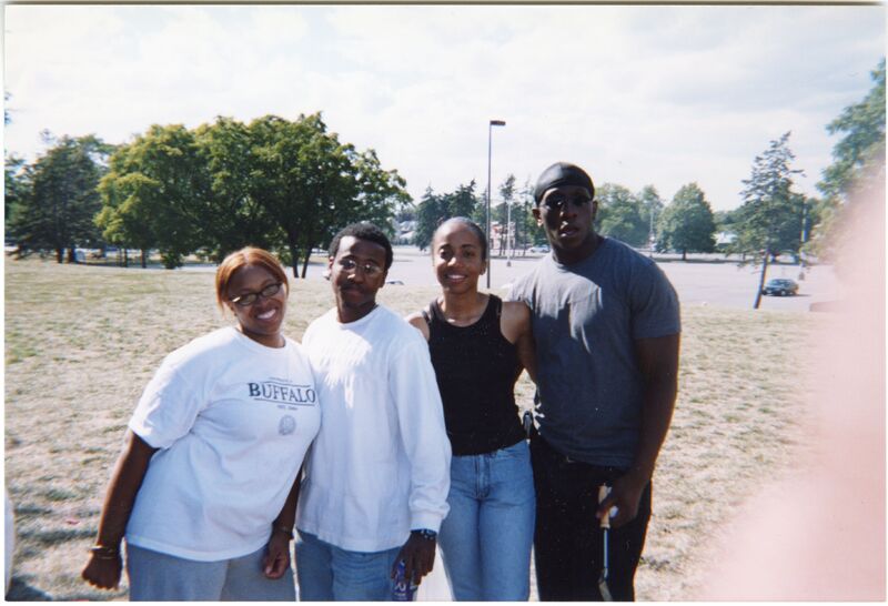 Color photograph of students at the 2002 Black Student Union Welcome Back Barbecue outside Goodyear Hall on South Campus.