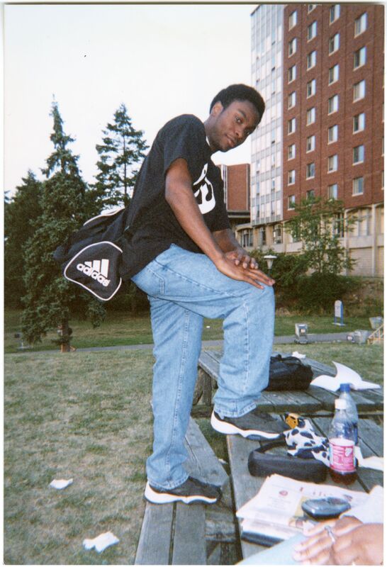 Color photograph of students at the 2002 Black Student Union Welcome Back Barbecue outside Goodyear Hall on South Campus.