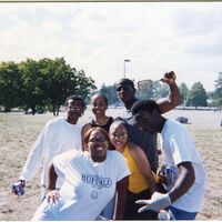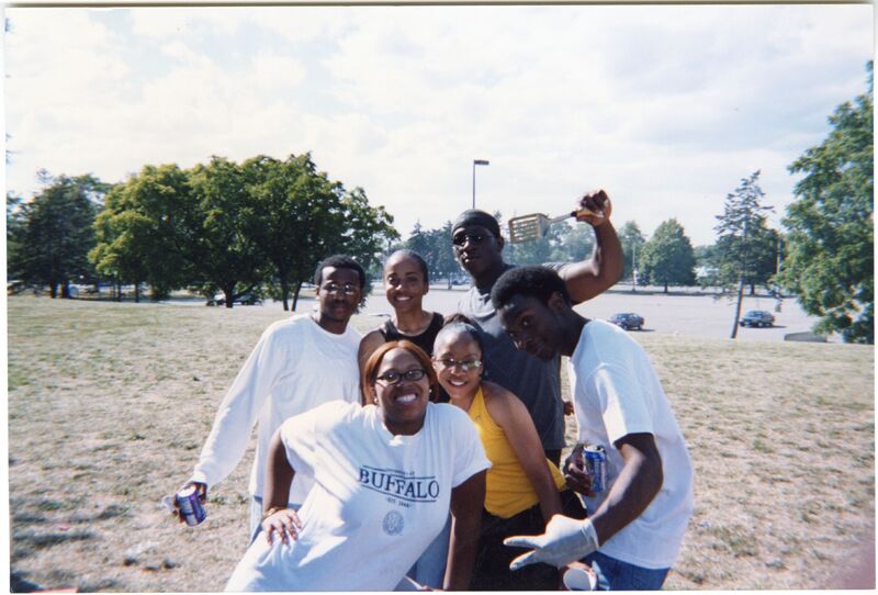 Color photograph of students at the 2002 Black Student Union Welcome Back Barbecue outside Goodyear Hall on South Campus.