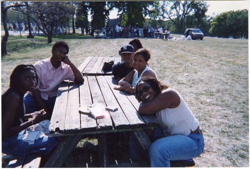 Color photograph of students at the 2002 Black Student Union Welcome Back Barbecue outside Goodyear Hall on South Campus.