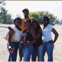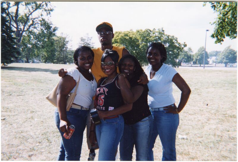 Color photograph of students at the 2002 Black Student Union Welcome Back Barbecue outside Goodyear Hall on South Campus.