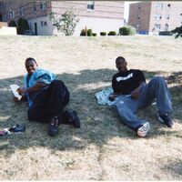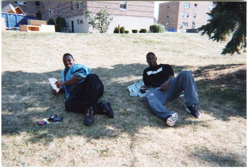 Color photograph of students at the 2002 Black Student Union Welcome Back Barbecue outside Goodyear Hall on South Campus.
