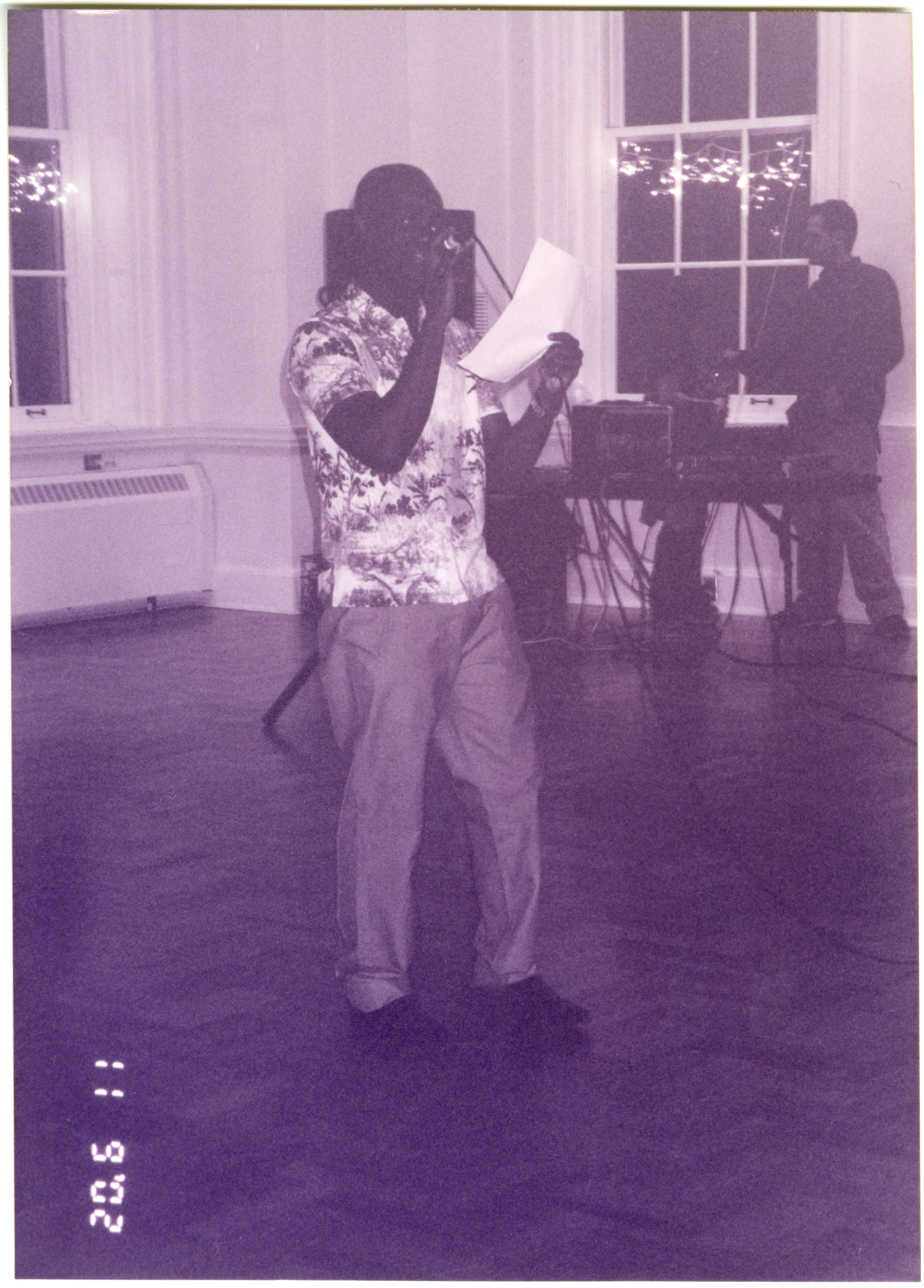 Black and white photograph of a speaker at Black Student Union event on South Campus in 2002.