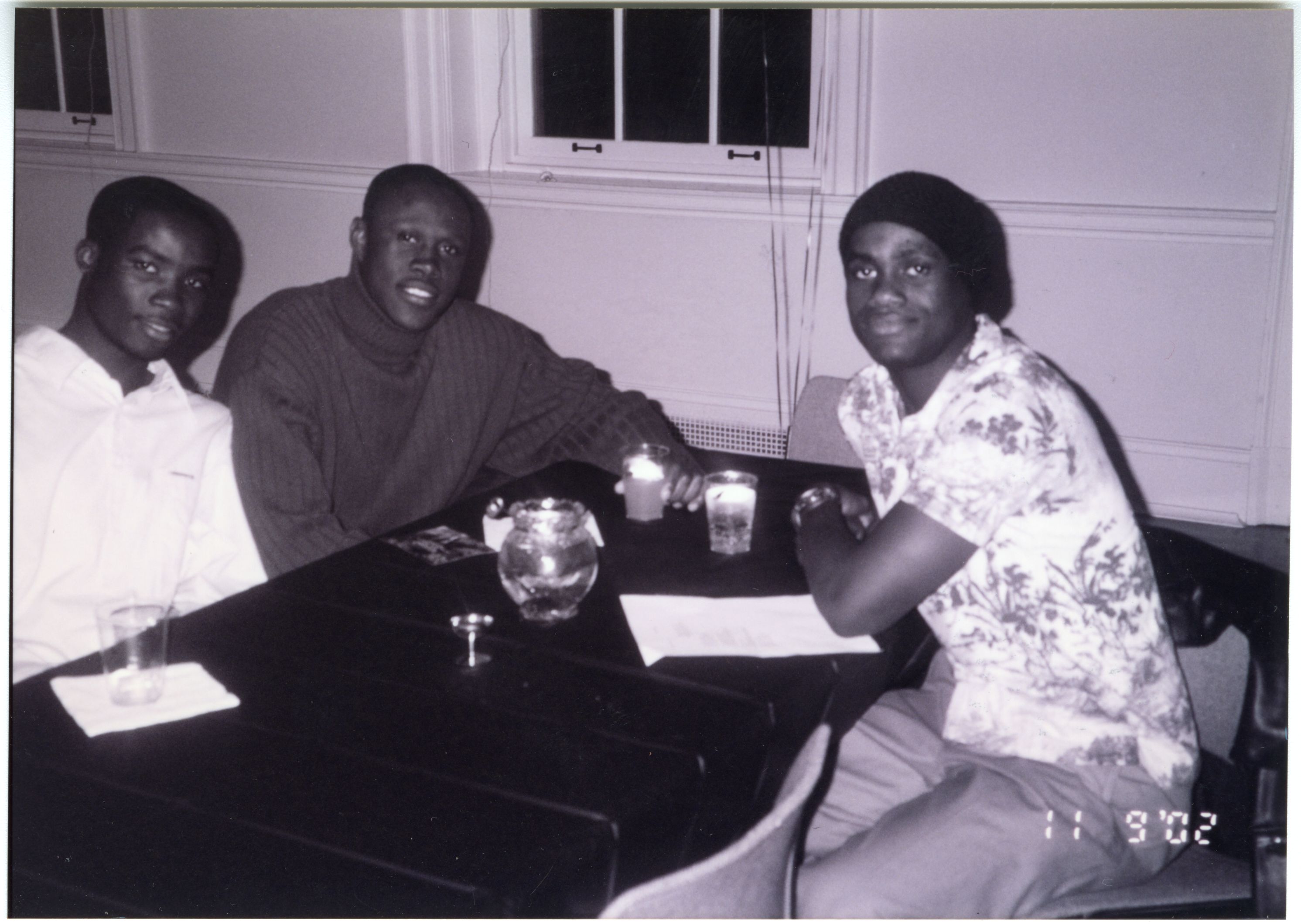 Black and white photograph of group of students at Black Student Union event on South Campus in 2002.