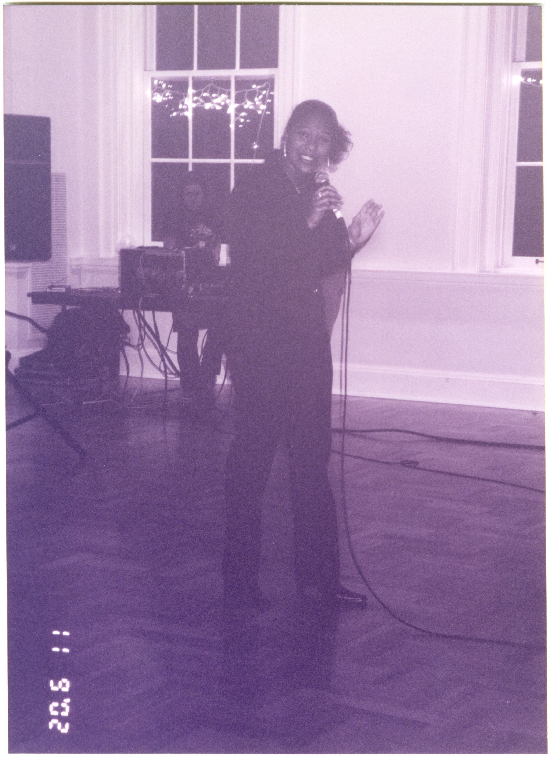 Black and white photograph of a speaker at Black Student Union event on South Campus in 2002.