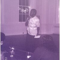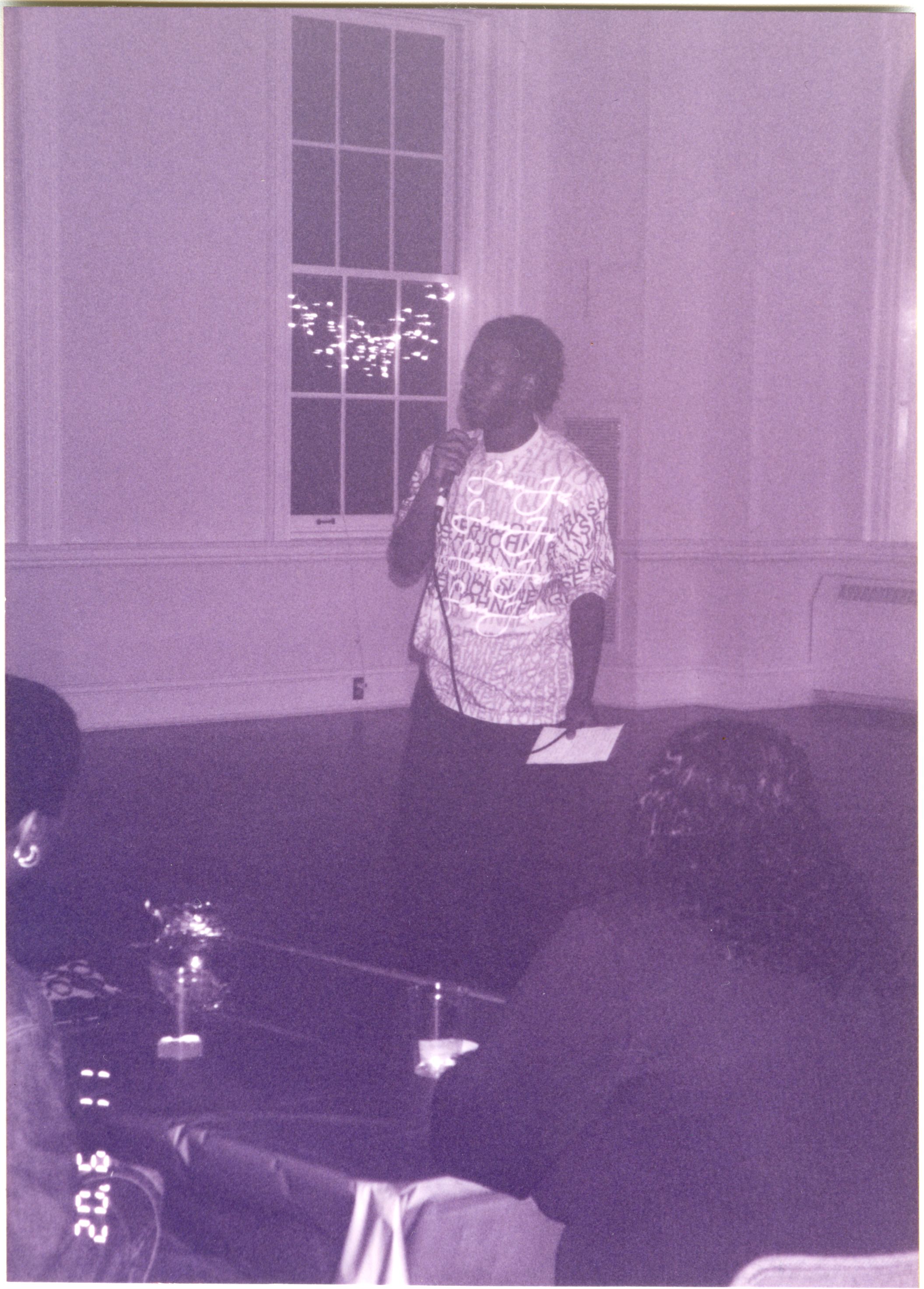 Black and white photograph of a speaker at Black Student Union event on South Campus in 2002.