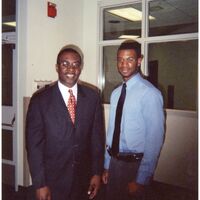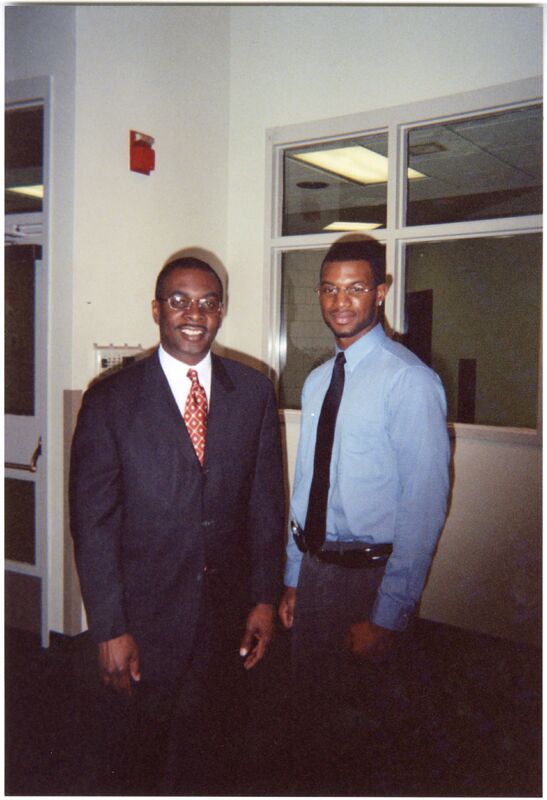 Color photograph of a student with Mayor Byron Brown at the Black Student Union's "Annual Pre-Kwanzaa Dinner" event in the Student Union, 2007.