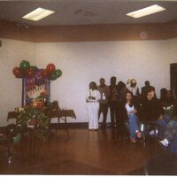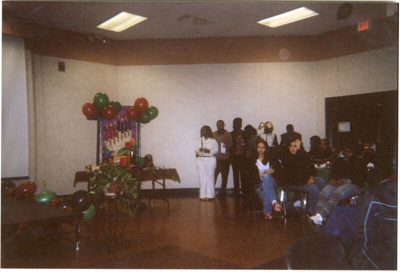 Color photograph of a group of students attending Black Student Union's "Annual Pre-Kwanzaa Dinner" event in the Student Union, 2007.