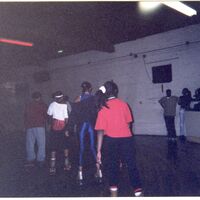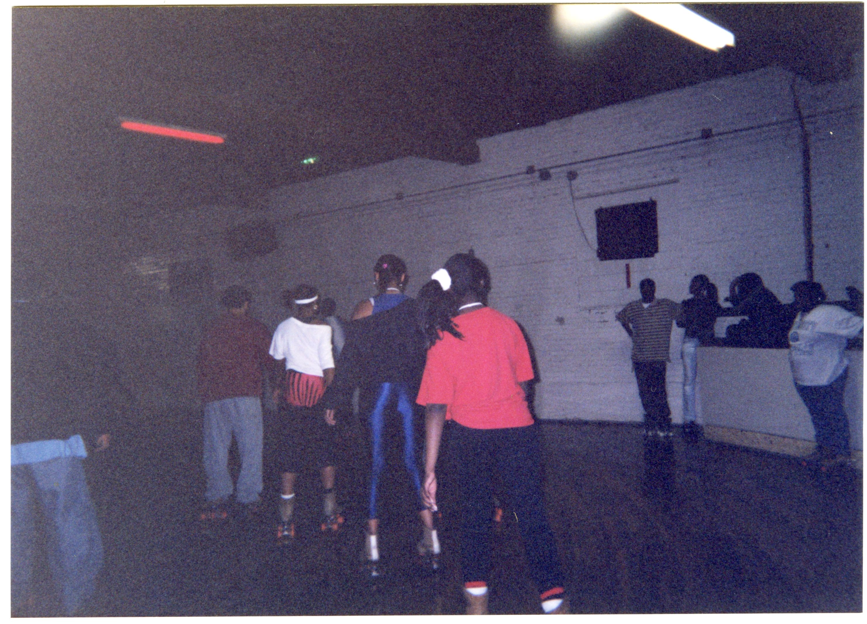 Color photograph of students at the 2003 Black Student Union Annual Skating Jam, "Playaz Ball."