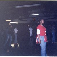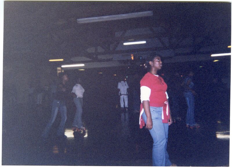 Color photograph of students at the 2003 Black Student Union Annual Skating Jam, "Playaz Ball."