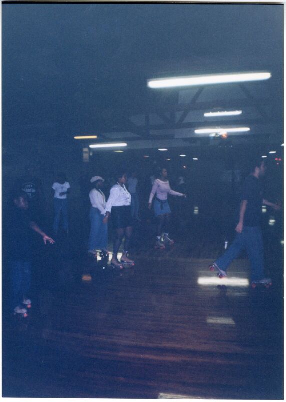 Color photograph of students at the 2003 Black Student Union Annual Skating Jam, "Playaz Ball."