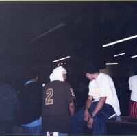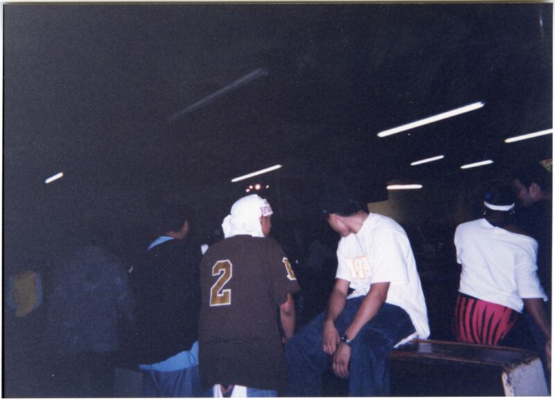 Color photograph of students at the 2003 Black Student Union Annual Skating Jam, "Playaz Ball."