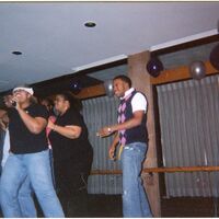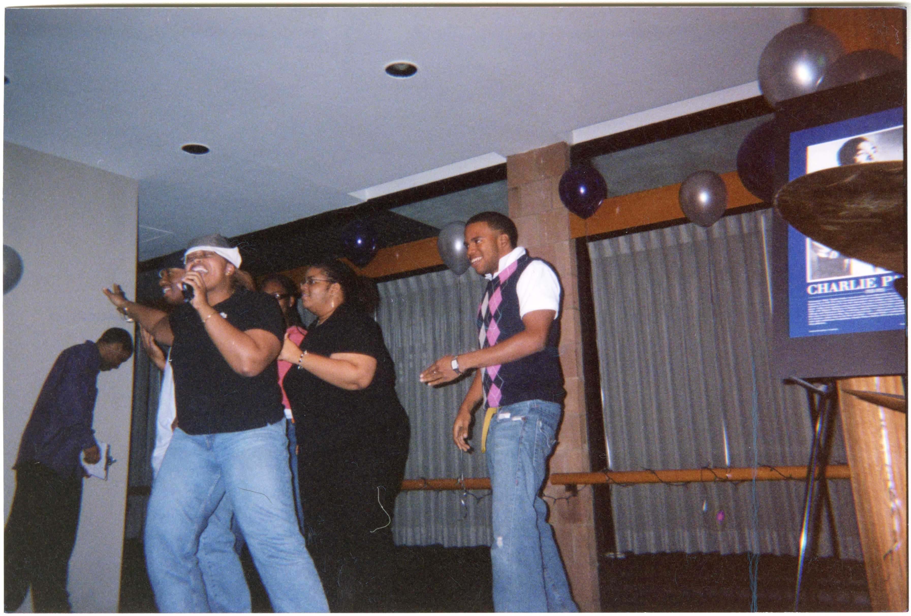 Color photograph of students performing at the Black Student Union's "Harlem Night" presented by "Boom-Boom Room" in Wilkson Coffee House on North Campus, 2005.