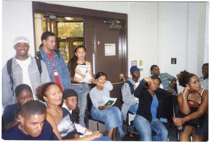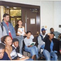 Color photograph of students sitting in a room in the Student Union, circa 2000s.