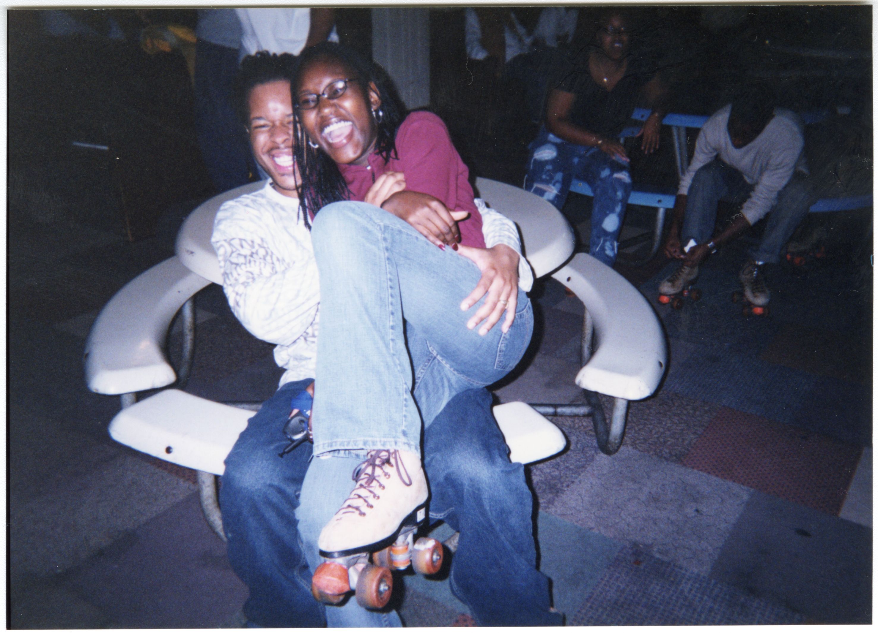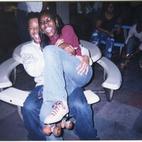Color photograph of students at the 2003 Black Student Union Annual Skating Jam, "Playaz Ball."