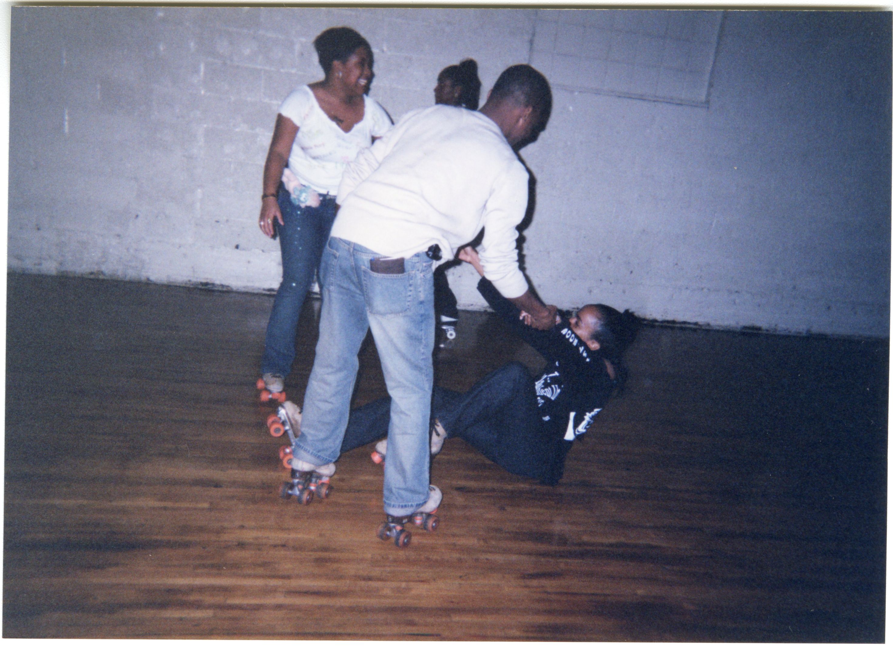 Color photograph of students at the 2003 Black Student Union Annual Skating Jam, "Playaz Ball."