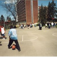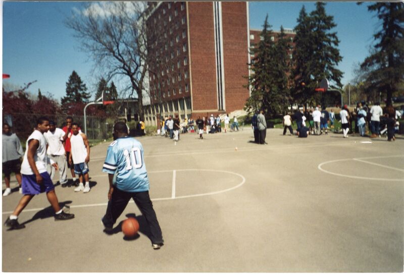 Color photograph of a group of students at an event, playing basketball in front of Goodyear Hall on South Campus, 2000.