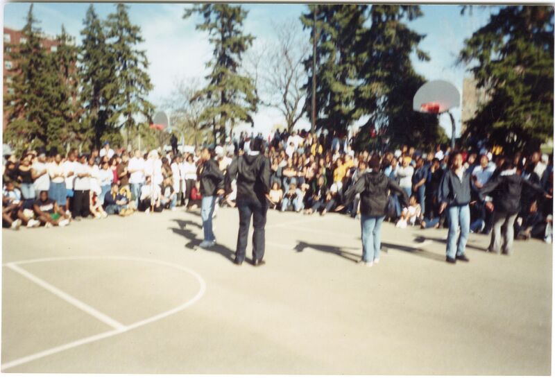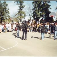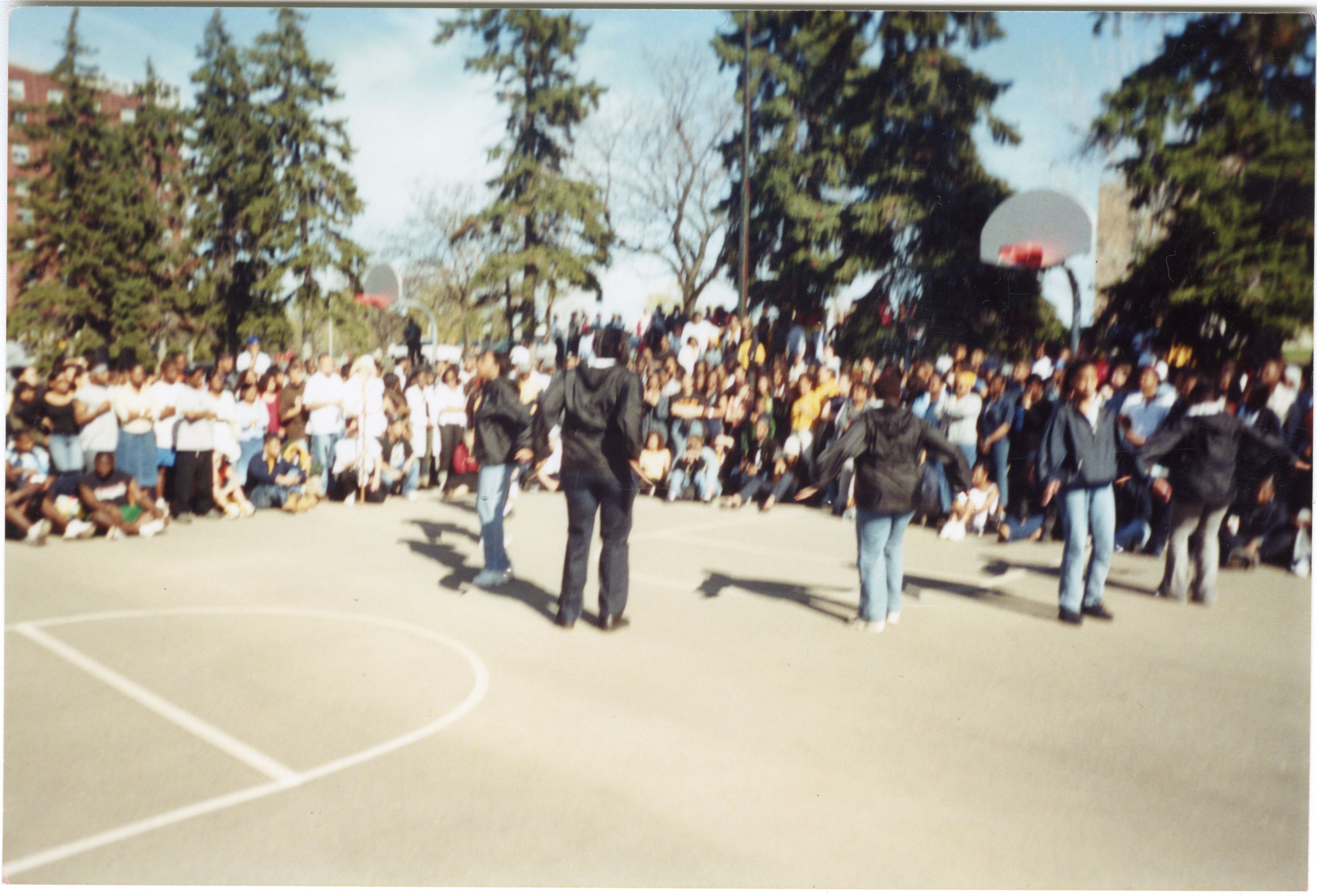 Color photograph of a group of students performing at an event outside of Goodyear Hall on South Campus, 2000.