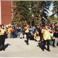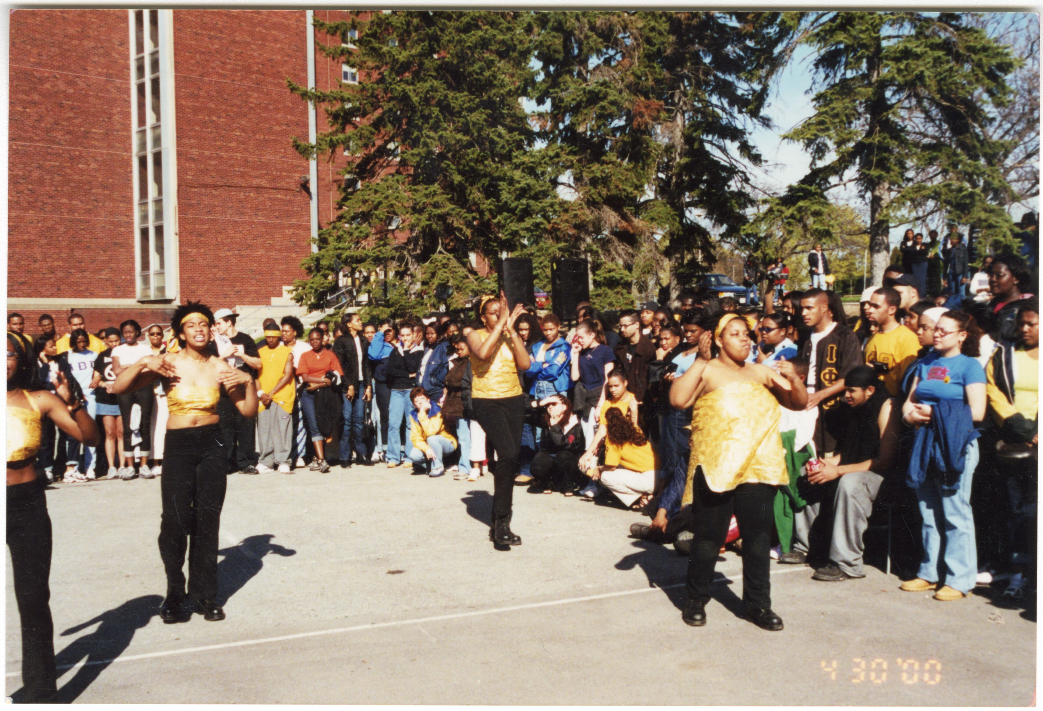 Color photograph of a group of students performing at an event outside of Goodyear Hall on South Campus, 2000.