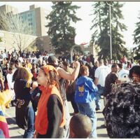 Color photograph of a group of students performing at an event outside of Goodyear Hall on South Campus, 2000.