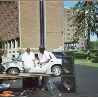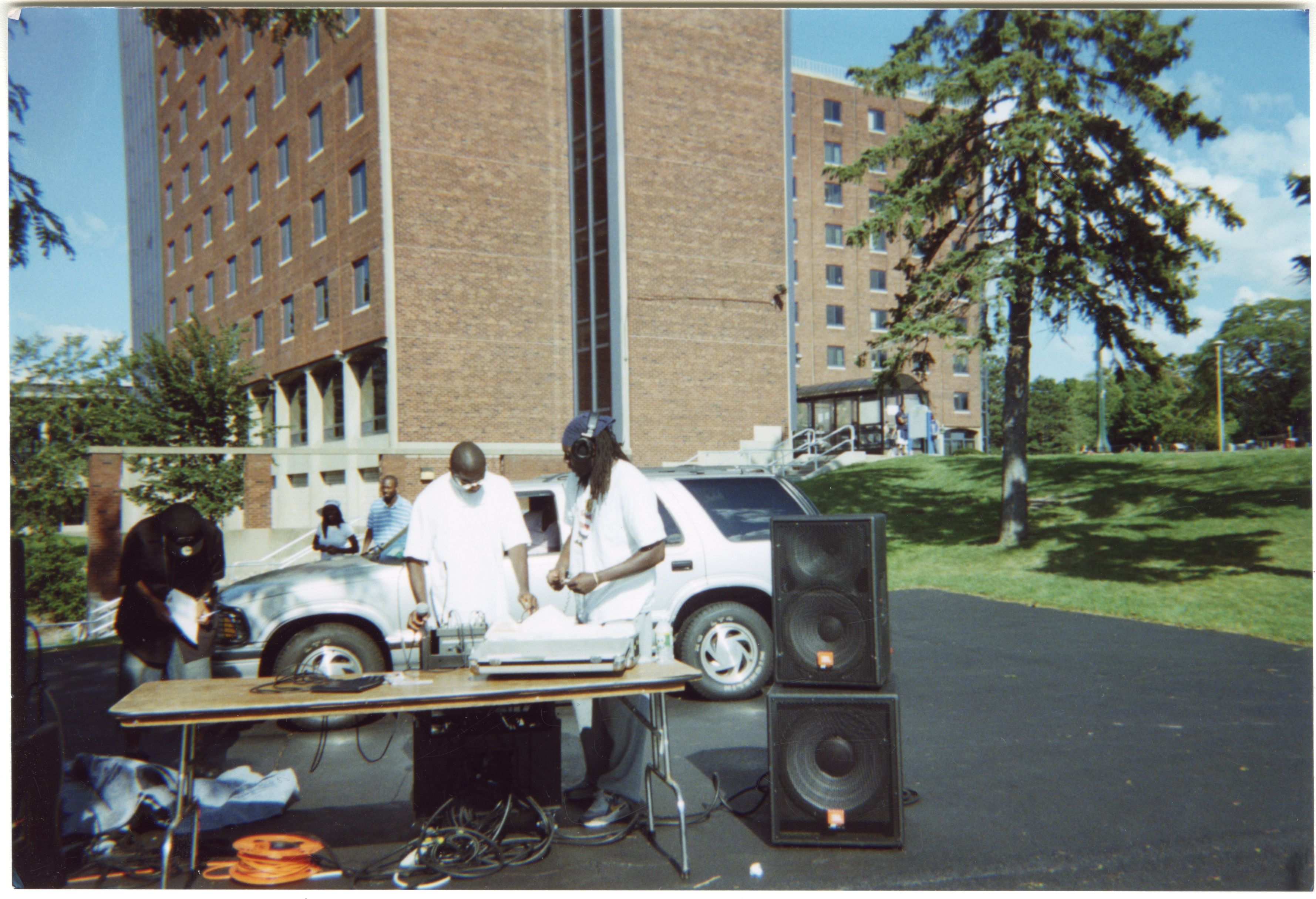 Color photograph of a group of students at an event outside of Goodyear Hall on South Campus, 2000.