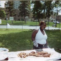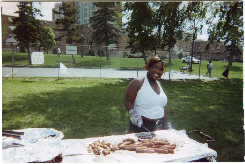 Color photograph of a student cooking at an event outside of Goodyear Hall on South Campus, 2000.