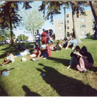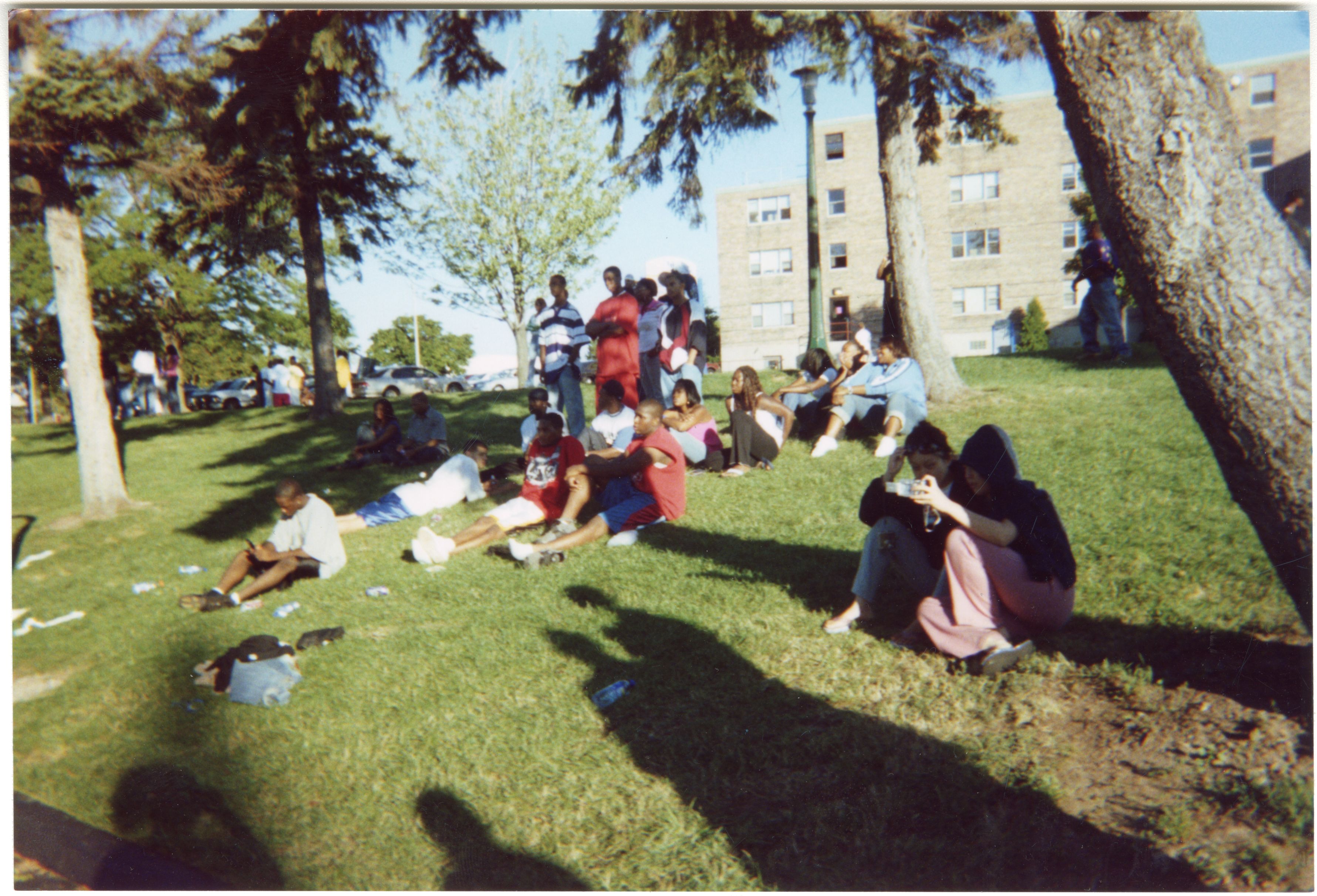 Color photograph of a group of students lounging on the grass at an event outside of Goodyear Hall on South Campus, 2000.