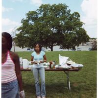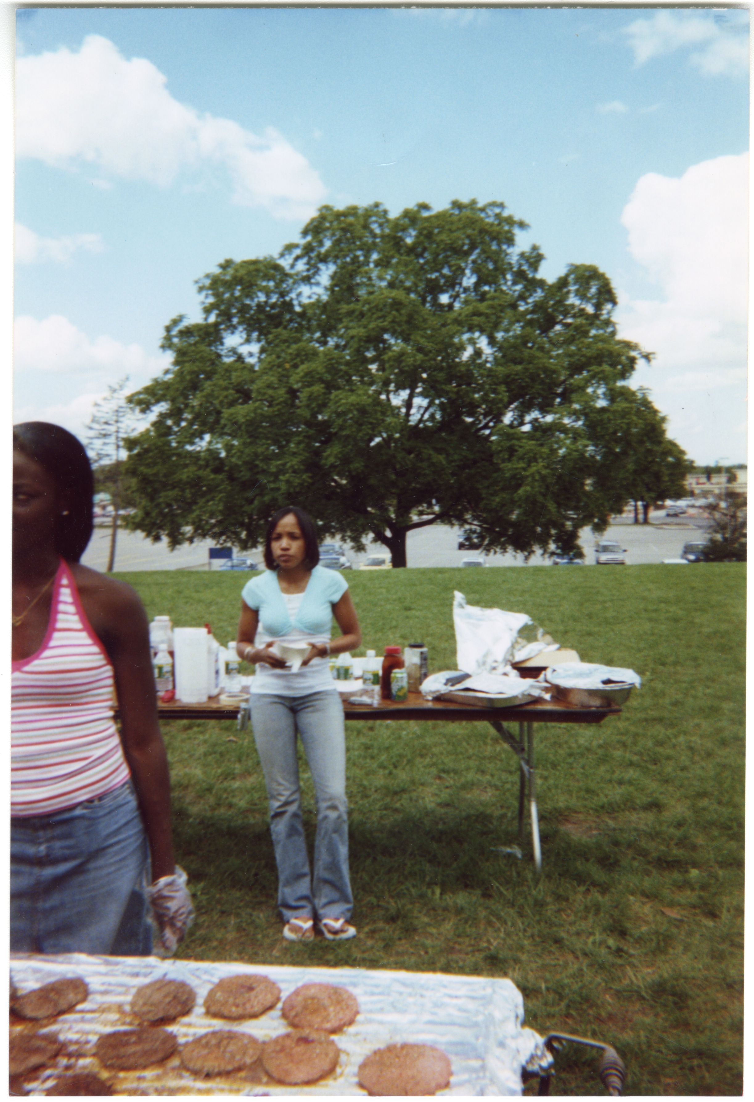 Color photograph of students at an event outside of Goodyear Hall on South Campus, 2000.