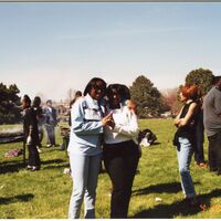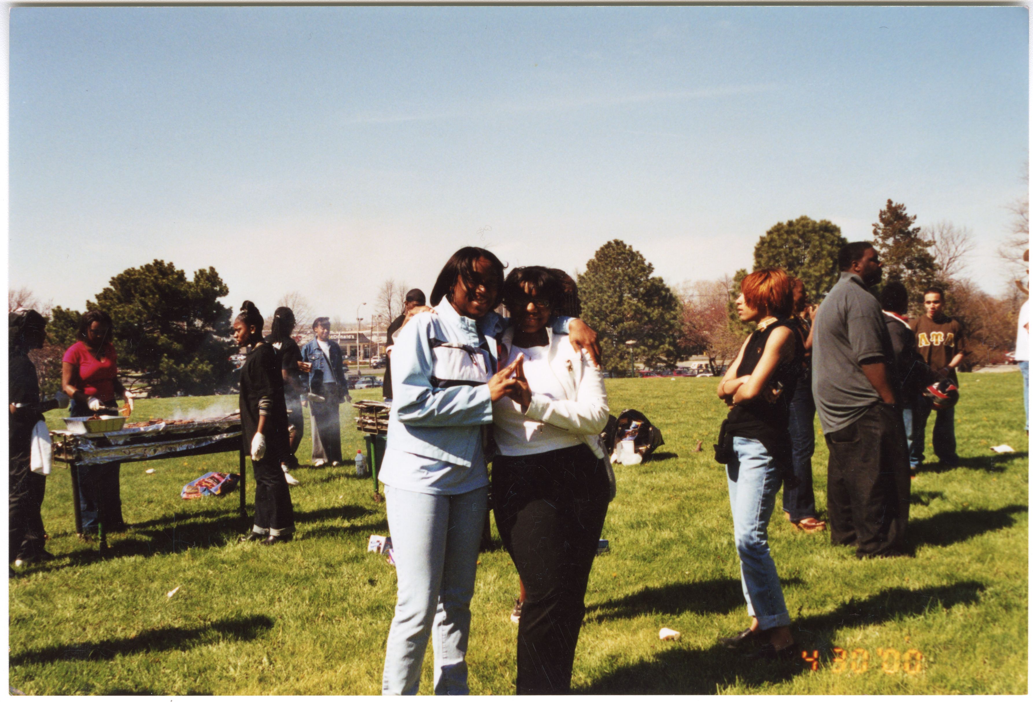 Color photograph of students at an event outside of Goodyear Hall on South Campus, 2000.