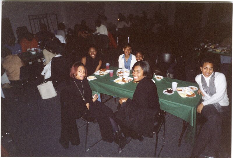 Color photograph of a group of students attending Black Student Union's "Annual Pre-Kwanzaa Dinner" event in the Student Union, circa 2000s.
