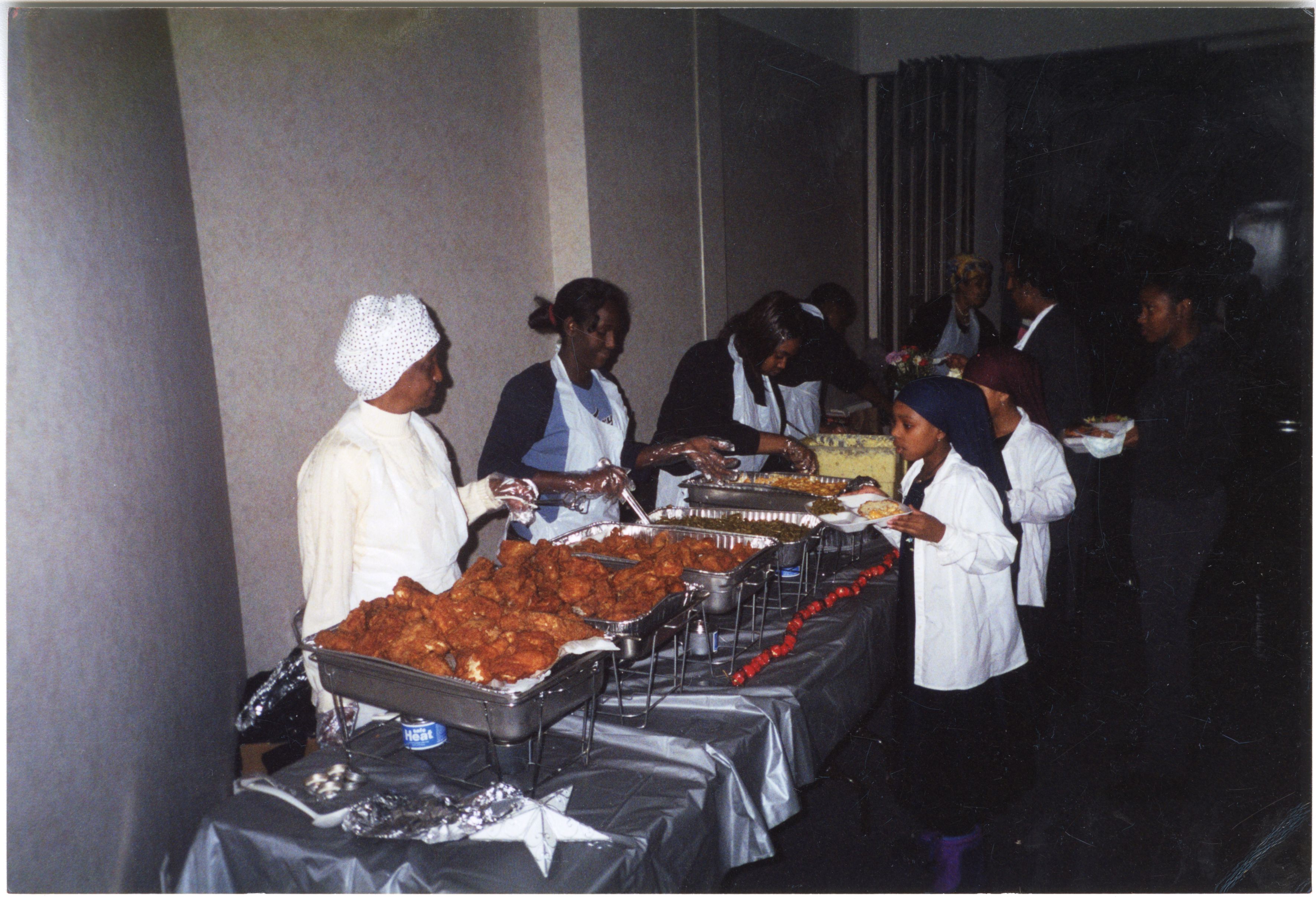 Color photograph of students serving food at Black Student Union's "Annual Pre-Kwanzaa Dinner" event in the Student Union, circa 2000s.