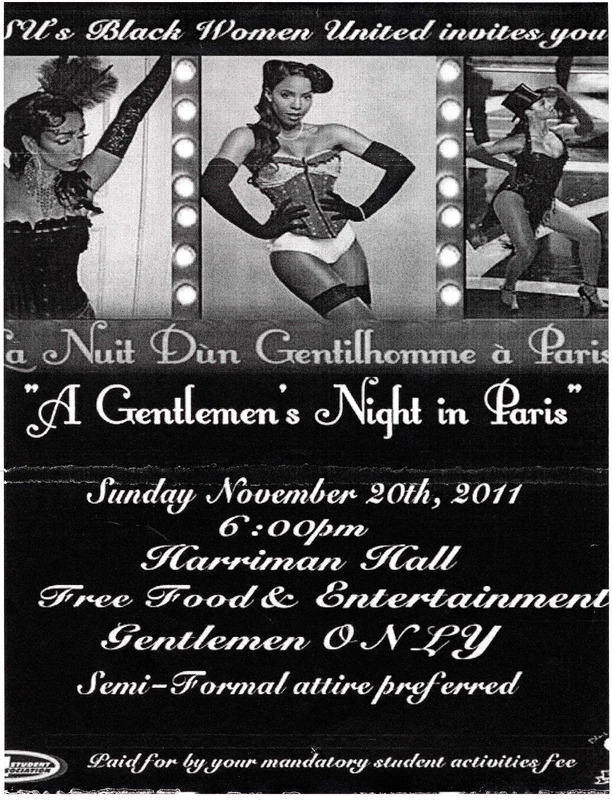 Photocopied flyer for the Black Student Union's Black Women United event, "A Gentlemen's Night in Paris" on November 20, 2011.