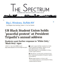 - Article from The Spectrum titled "UB Black Student Union holds 'peaceful protest' at President Tripathi's annual address" by Gabriela Julia. Printed from The Spectrum's website.