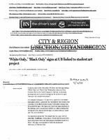 White Only,' 'Black Only' signs at UB linked to student art project, September 16, 2015 Photocopied pages from Buffalo News article "'White Only,' 'Black Only' signs at UB linked to student art project," September 16, 2015.