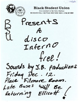 Disco Inferno flyer, December 9, 1980 Photocopied hand-drawn flyer for a free disco inferno presented by the Black Student Union on December 9, 1980.
