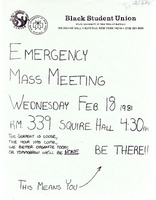 Emergency Mass Meeting flyer, February 18, 1981 Hand-drawn flyer for an emergency Black Student Union Mass Meeting on February 18, 1981.