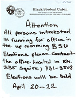 Elections flyer, March 25, 1981 Handwritten flyer for the Black Student Union's elections on April 20-22, 1981.