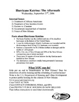 Hurricane Katrina: The Aftermath, September 27, 2006 Typed handout with information about Hurricane Katrina, dated September 27, 2006. Handout has the Student Association logo on it. Includes handwritten note: "Skating Jam 10/27/06."