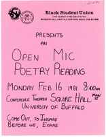 Open mic poetry reading flyer, February 16, 1981 Hand-drawn flyer for an open mic poetry reading presented by the Black Student Union on February 16, 1981