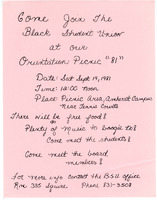 Orientation picnic flyer, September 19, 1981 Handwritten flyer for the Black Student Union's orientation picnic on September 19, 1981.