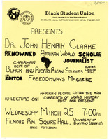 Dr. John Henrik Clarke lecture flyer, March 25, 1981 Hand-drawn flyer for scholar and journalist Dr. John Henrik Clarke's lecture in the Filmore Room on March 25, 1981. Event sponsored by the Black Student Union.