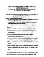 General meeting discussion handout, September 20, 2006 Typed handout with information and discussion questions on the topic "Interracial Relationships: Black Community Acceptance or Rejection" for the Black Student Union's general meeting on September 20, 2006.
