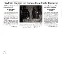 Students Prepare to Observe Hanukkah, Kwanzaa, December 6, 2004 Photocopied newspaper clippings of The Spectrum article "Students Prepare to Observe Hanukkah, Kwanzaa" which includes two articles: "BSU Stresses Unity, Values at Kwanzaa Teach-In" by Natia Daviti and "Students End Semester With Eight Days of Hanukkah" by Erica Hood, December 6, 2004. Second page contains continuation of the article on BSU's celebration of Kwanzaa.