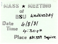 Mass meeting flyer, April 8, 1981 Hand-drawn flyer for the Black Student Union's mass meeting on April 8, 1981.