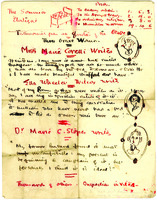 Autograph letter signed from Charlotte Mew to Alida Klementaski Monro, 1917 Autograph letter signed from Charlotte Mew to Alida Klementaski Monro dated 1917. Charlotte Mew sketches a mattress and portraits of three imaginary individuals giving testimonials about the mattress. Recto of page 2 has been rotated for readability. On this page, Mew sketches a dog in a chair, a bird, and bags of seed. Text added later in pencil reads: "C.M.'s parrot thanks A.M.'s dog for [illegible]."
