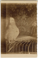 Photograph of Charlotte Mew's parrot, undated Blurred, sepia-toned photograph of Charlotte Mew's parrot, known as Wek or Willie, perched atop his cage, undated.